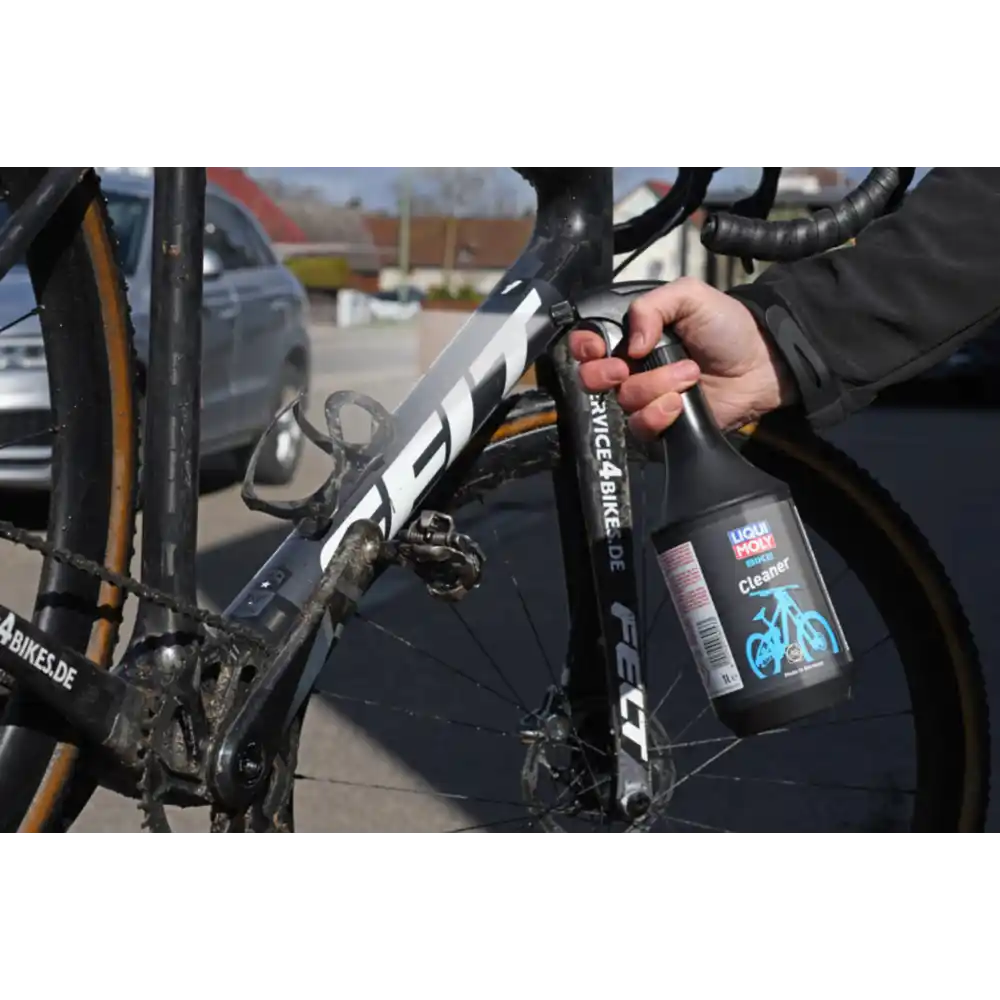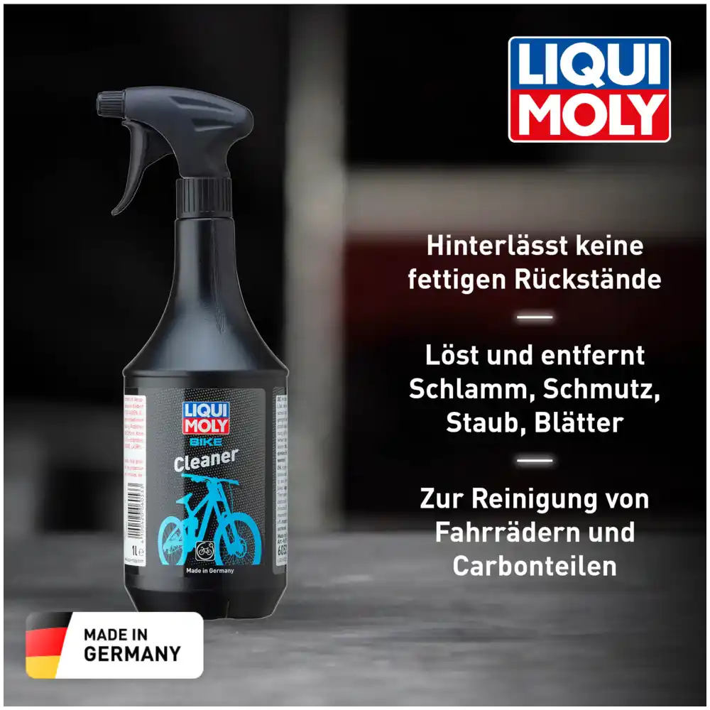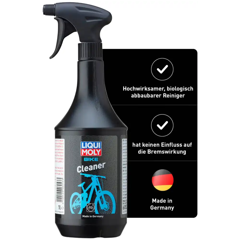 LIQUI MOLY Bike Cleaner 1 l ist ein hochwirksamer, biologisch abbaubarer Fahrradreiniger, der speziell für stark verschmutzte Fahrräder entwickelt wurde. Er entfernt Schlamm, Staub, Schmutz, Blätter und andere Verschmutzungen schnell und zuverlässig, ohne fettige Rückstände zu hinterlassen oder die Bremswirkung zu beeinträchtigen.