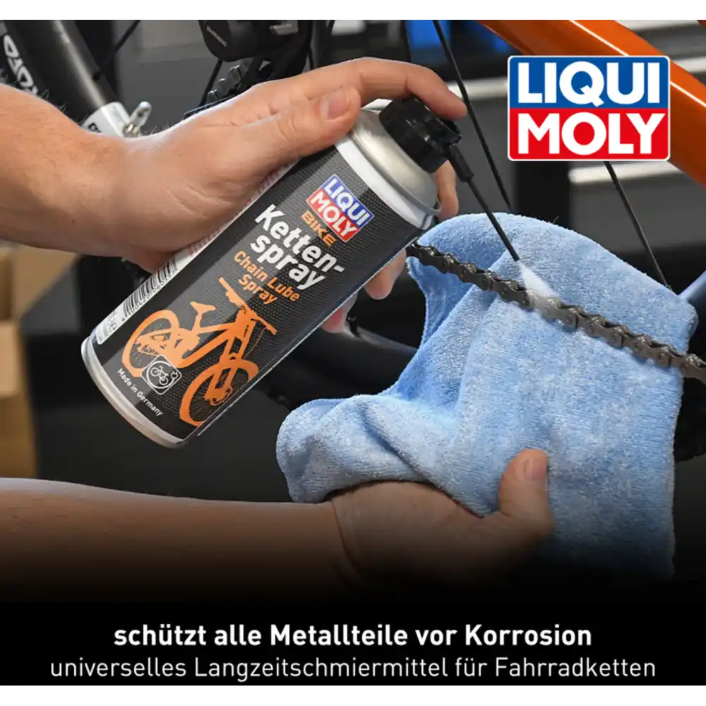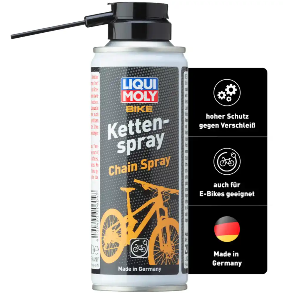 Das LIQUI MOLY Bike Kettenspray 200 ml in Schwarz ist ein universelles Langzeitschmiermittel für Fahrradketten, das unter feuchten, schmutzigen sowie trockenen und staubigen Bedingungen hervorragende Schmierleistung bietet. Es verdrängt Feuchtigkeit, wirkt wasserabweisend, sorgt für ruhigen Kettenlauf und verfügt über gute Kriech- und Haftwirkung. Das Spray schützt alle Metallteile vor Korrosion, ist neutral gegenüber Kunststoffen, Lacken und Metallen und biologisch abbaubar auf pflanzlicher Basis. Ideal für den Einsatz an Fahrrad- und E-Bike-Ketten.
